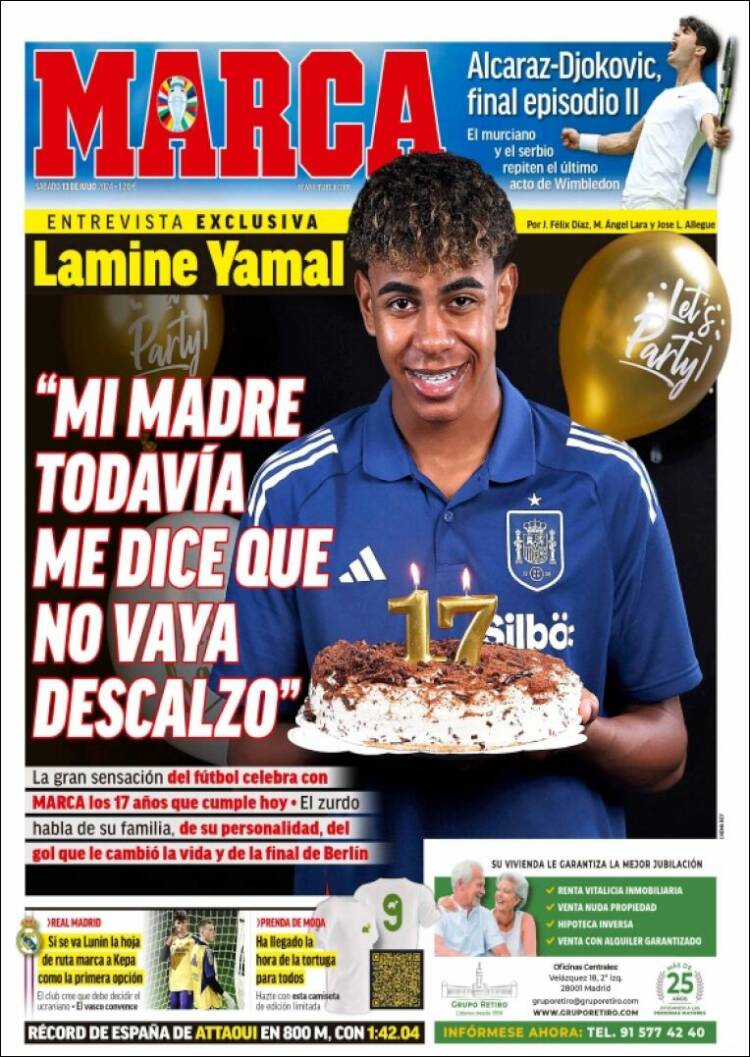 La portada de Marca centra todo el foco en Lamine y sus 17 años, algo que está bien que nos recuerden porque apenas hemos escuchado a Juan Carlos Rivero decir la edad del chico durante estas semanas de campeonato. Si la anterior Eurocopa fue la de “no se olviden del estreno de Operación Camarón”, esta será recordada por la del “y solo tiene dieciséis años”.