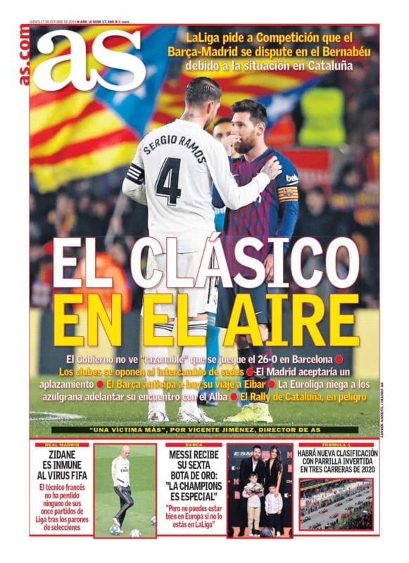 La portada de As nos traslada el conflicto de la fecha del partido, ocasionada por los fuegos no precisamente artificiales que ayer saludaban la sexta Bota de Oro del astro predilecto de los CDR. Y de mucha más gente, ya lo sabemos, pero valga la parte por el todo en aguda metonimia. Considerando que el partido no se puede jugar en la fecha prevista por las acciones llevadas a cabo por turbas movidas por muchas razones, pero entre ellas el comunicado emitido por uno de los contendientes, bueno sería que se considerara en algún momento la posibilidad de que el otro contendiente nada tiene que ver, en cambio, con el conflicto, y que fuera tratado conforme a esa certeza.