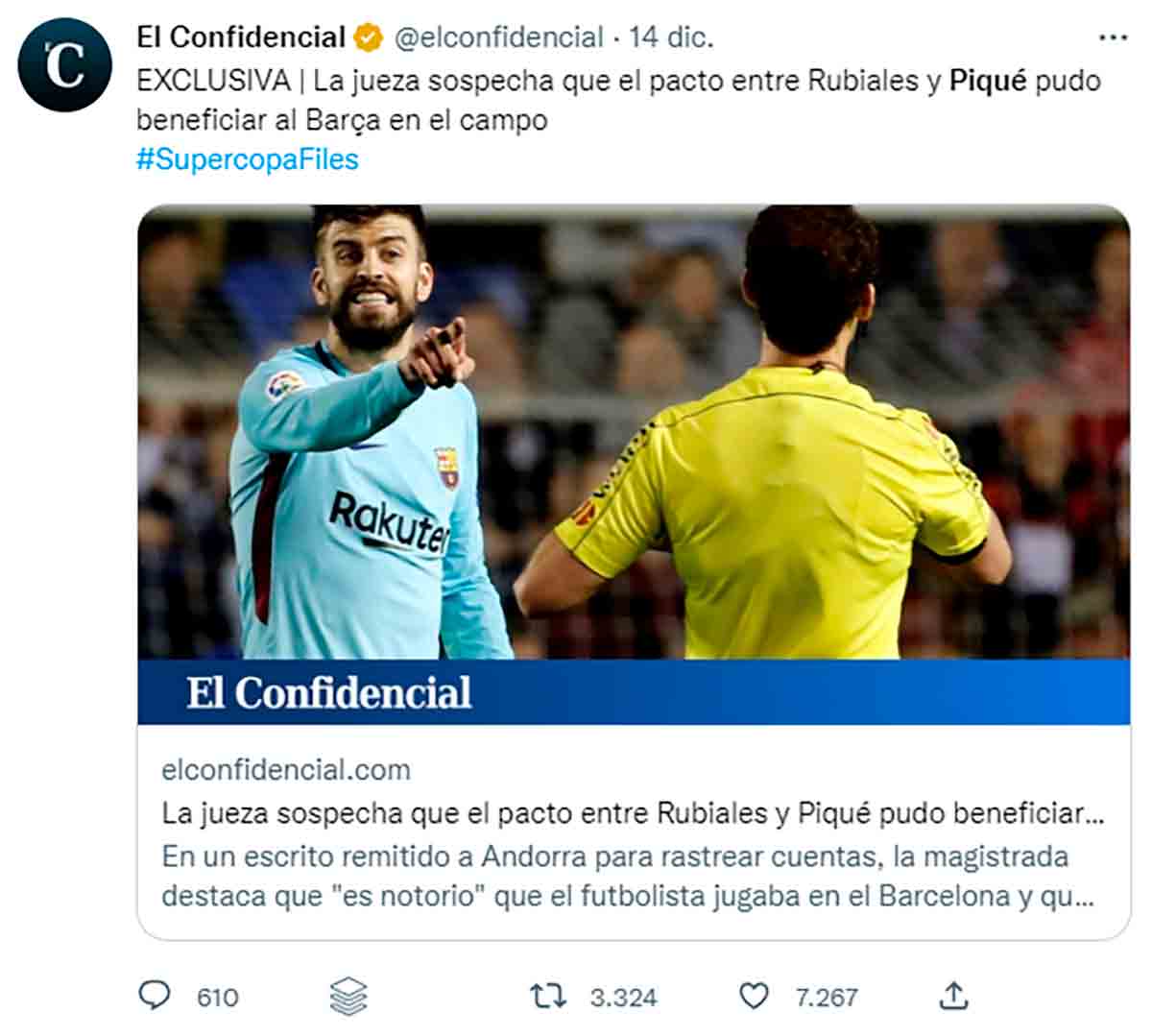 Piqué estaba en activo cuando negociaron y firmaron sus acuerdos, al equipo de Geri, el F. C. Barcelona, le arbitraban (y lo siguen haciendo) colegiados que dependen de la RFEF presidida por Rubiales, a quien económicamente le interesaba que el club de Piqué se clasificara para la Supercopa de España porque parte de su sueldo lo percibía en variables que contemplaban este aspecto. No hace falta ni que Rubiales dijera nada, que seguro que no lo ha hecho, pero ¿cómo sale un árbitro a dirigir un encuentro en el que sabe que si el Barça gana la institución y el jefe del cual depende van a ganar más dinero? Hay más aspectos oscuros, pero ya los hemos tratado en repetidas ocasiones.