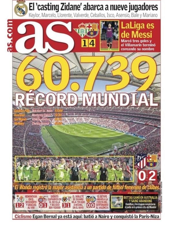 Marca y As, por su parte, dan cuenta de la recaudación récord del partido de fútbol femenino disputado ayer en el Wanda. Dábamos por hecho que esto serviría a Relaño para arremeter contra el Madrid por carecer de sección de fútbol para chicas, pero se ha inmiscuido el centenario del Valencia. Las enormes cifras de recaudación, en todo caso, parecen sugerir que no solo el Madrid haría bien en cubrir una demanda social instaurando la sección, sino que ésta, bien concebida y llevada, podría no tener que ser deficitaria a la fuerza. Sería muy bueno que se hiciera.