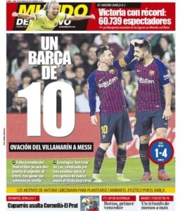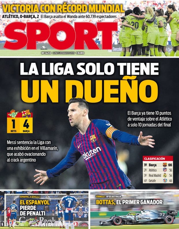 Buenos días. El Barcelona es virtual ganador de la Liga tras su fácil victoria ante un Betis entregado en cuerpo y alma, que en este caso equivale a decir “en equipo y público”. No nos parece mal, que conste, que los asistentes al Villamarín prorrumpieran en aplausos a Messi (lo hace constar Sport en el destacado inferior izquierdo), si bien lo de corear su nombre (tal como sucedió) nos parece que llega a un punto de cierto papanatismo que desnaturaliza la necesaria pugna, o al menos la sensación de la misma que debe caracterizar un choque deportivo.