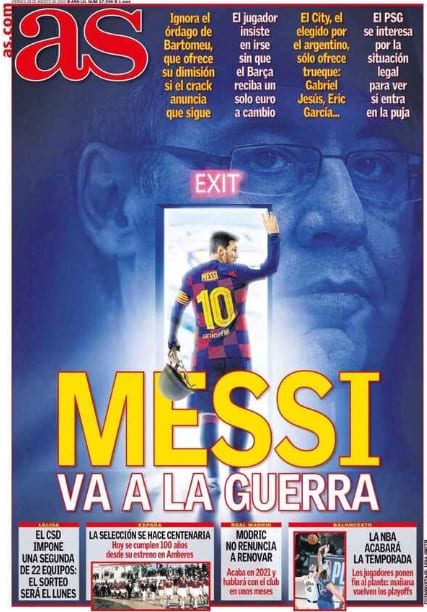 Messi va a la guerra, nos sugiere la Ouija haciéndose eco del último y del penúltimo rumor. El que dice que Bartomeu ha dicho que si él es el problema dimite y el que dice que Leo va a responder a estas palabras de su, todavía, presidente que nadie ha escuchado pronunciar. Por supuesto, damos por hecho que estas declaraciones del argentino también serán en privado. No le faltaba razón a aquellos que sostenían que la Guerra del s. XXI sería virtual. A los contendientes señalados se añaden, según AS, otros aliados, como el Manchester City y el PSG, obviamente sin mediar tampoco declaración alguna. El fondo de la portada, en tono azulado, recuerda mucho al cartel de la película "Star Wars: la amenaza fantasma", con el rostro del malvado Darth Sidious de fondo - en este caso Bartomeu - y la figura de un joven Obi-Wan Kenobi, superpuesta, representando al héroe- Leo Messi, en la versión de la Ouija-.
