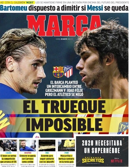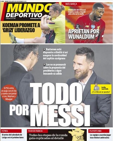 Pero si hay una portada que resulta reveladora del transfondo de esta psicofonía - que solo son capaces de percibir ellos - es la de Godó, grande de España. Mundo Deportivo sugiere que Bartomeu abre la posibilidad de la permanencia de Leo Messi, al poner su cargo a disposición de la del astro - como si en algún momento no lo hubiera estado-, al mismo tiempo que en su cabecera reconoce que Griezmann será el nuevo líder del vestuario. ¿Le ha prometido Koeman a Antoine el liderazgo del equipo a sabiendas de que Messi ya no estará? Eso parece, de lo cual se deduce que la cabeza de Bartomeu siempre ha estado sobre los hombros de Josep María. Pero ¿por qué titula entonces Santi Nolla su editorial "¿Y si Messi se queda?", tal y como reza en portada? ¿Nos están diciendo que están engañando a Griezmann?