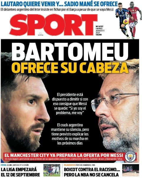 Sport no solo muestra las cabezas del joven jedi y de Palpatine sino que pone en riesgo la de este, haciéndose eco, en el titular, de su predisposición silenciosa a entregarla. Pero para fantasmal la cabecera del diario de Albert Sáez, recién estrenado en la dirección. Tras medio año anunciando que Lautaro quiere venir para jugar al lado de Messi, ahora por lo visto también quiere venir para no jugar con él. Pero ojo, no queda ahí la cosa, porque al argentino del Inter de Milán se añade en su deseo espectral el de Sadio Mané. La estrella del Liverpool no quiere perder la ventana de oportunidad que se le ha abierto pudiendo cambiar a un equipo que viene de arrasar en la Premier League por otro que ha sido el hazmerreír de toda Europa hace unos días, la ocasión única que supone dejar de ser entrenado por Jürgen Klopp para ser dirigido por ese hombre lobo en que se ha convertido Ronald Koeman. La perspectiva de estar en nómina de un club propiedad del magnate John W. Henry, dueño de los Boston Red Sox, a cobrar con retraso como le está sucediendo últimamente a los jugadores del Fútbol Club Barcelona.