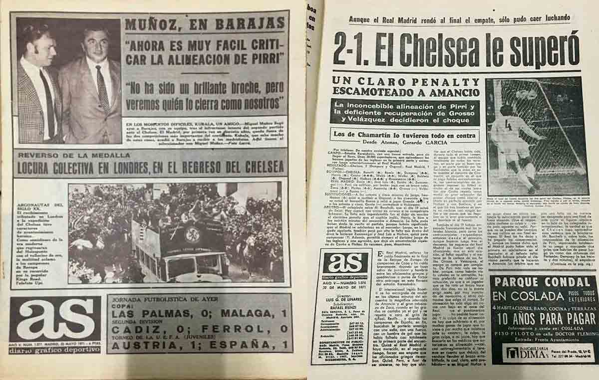 A por la prórroga. Treinta minutos de intenso dominio de los blancos, pero entre el meta Bonetti y la mala fortuna, todo quedó en empate. ¿Penaltis? No los había en aquella época, y hubo que ir al partido de desempate, en el mismo estadio de Karaiskakis dos días más tarde. En el segundo partido fueron mejores los ingleses —hay que reconocerlo—, se pusieron 2-0 al descanso y aunque Fleitas acortó diferencias, la Recopa se marchó para Londres. No sé si lloré, pero el disgusto fue de padre y muy señor mío. El primer disgusto futbolístico de mi vida. Y el primer disgusto, como el primer amor, nunca se olvida.