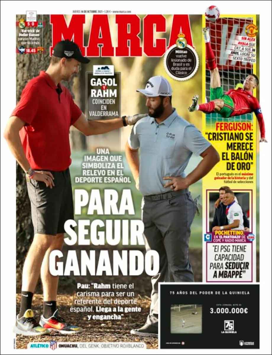 La portada de Marca también recoge la petición de Sir Alex Ferguson para que Cristiano Ronaldo gane el Balón de Oro. Tanto Ferguson como Cristiano son dos personalidades con autoridad en el mundo del fútbol, pero creemos sinceramente que este año no hay duda acerca de quién merece el galardón que otorga France Football, y ese no es otro que Karim Benzema. Otro asunto es si tiene posibilidades de ganarlo debido a la propia naturaleza del trofeo.