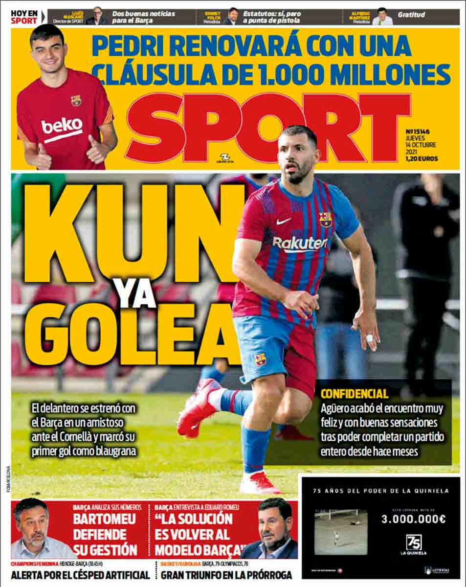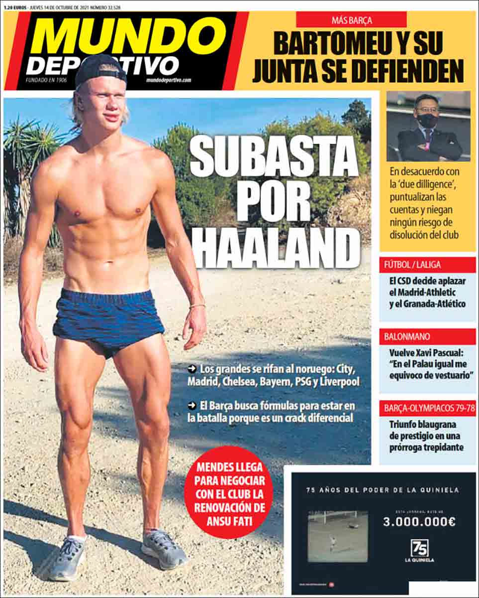 Observamos ahora las portadas de Mundo Deportivo y Sport. Ambas dedican su fotografía destacada a dos futbolistas, Haaland y Agüero, de los cuales parece que uno se toma más en serio la preparación física que el otro.