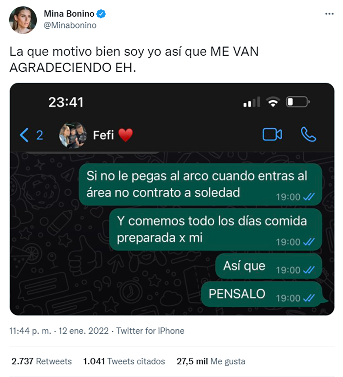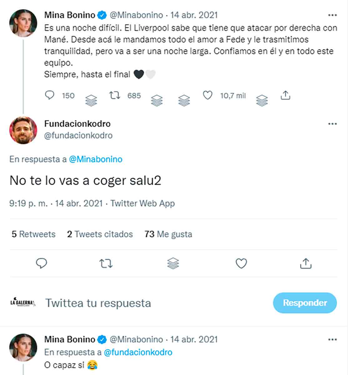 Incluso se divulgó el vídeo de la escena del gol de Fede en el seno del hogar de los Valverde. El salto que pega Mina es digno del Santillana de los mejores tiempos, y ciertamente nos dolió menos ver a Mina quitándose la camiseta que ver al Pájaro hacer lo propio en Riad, granjeándose una tarjeta completamente innecesaria. Mina vive su amor por Fede un poco como lo vivimos todos, con algunas cuestiones puntuales que obviamente distinguen su amor del nuestro y está bien que así sea, repetimos. Mina tiene un perfil de Twitter que no llama la atención, de ahí que algún tuitero desavisado cometiera alguna vez algún error de concepto.