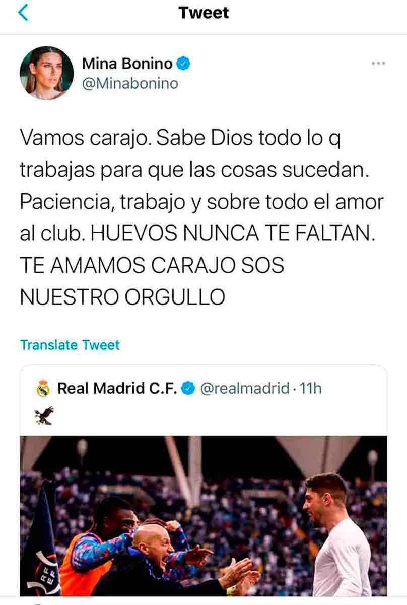 Ayer nos enamoró especialmente con sus tuits supercoperos. Se desvive por su hombre, ejerciendo también de portavoz de la criatura que tienen en común, de una manera que desarma por su candidez y a la vez por su expresividad. Ella también es una di noi, y de qué manera. Sus argentinismos añaden gracia rioplatense al cóctel, y ya solo resta envolverla en la bandera blanca con el escudo coronado para depositarla radiante en los brazos de su esposo, contentos y satisfechos de haber servido meramente para cubrir el recorrido. Hay mocitas que van alegres y risueñas porque juega su Madrid (porque juega su hombre) sin necesidad de haber nacido en Chamberí. Lo de la universalidad del madridismo tiene un alcance transversal, marital, que acaso no habíamos tenido en cuenta antes. Las mocitas no madrileñas (pero sí madridistas) de Alaba y Militao, que ven juntas los partidos y son también di noi, resultan buena prueba colateral de de ello. Pero ya tendrán ellas su sección un día, hoy estamos con Mina.