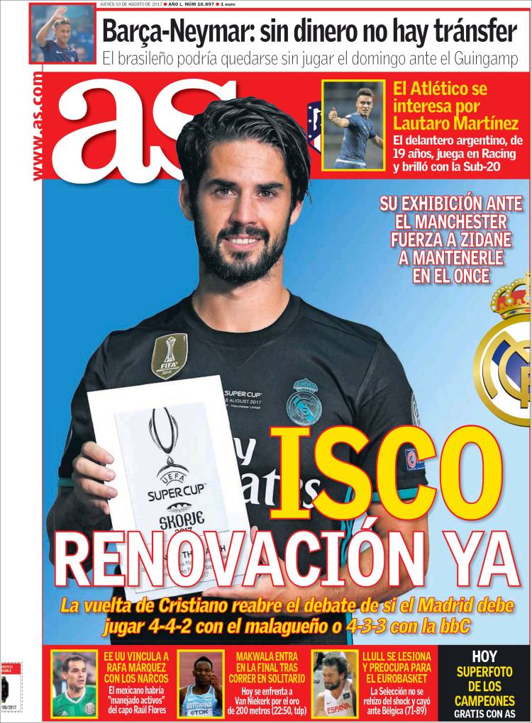 Ahí lo tenéis, queridos amigos. Isco como ariete contra la bbC (al pronunciarse no se nota pero lo podéis ver escrito en la parte inferior): un clásico. as se pronuncia distinto de As pero bbC se pronuncia de manera idéntica a BBC por la sencilla razón de que lo de bbC denota muy poca sabiduría futbolística y, lo que es infinitamente peor, muy poca gracia, de manera que se niega el tímpano a registrar la idiotez. Quitarle la mayúscula a As (a as) es en cambio un acto de reparación, y por eso lo compulsa el oído. Probad en vuestras casas, no hace falta que sea delante del espejo.