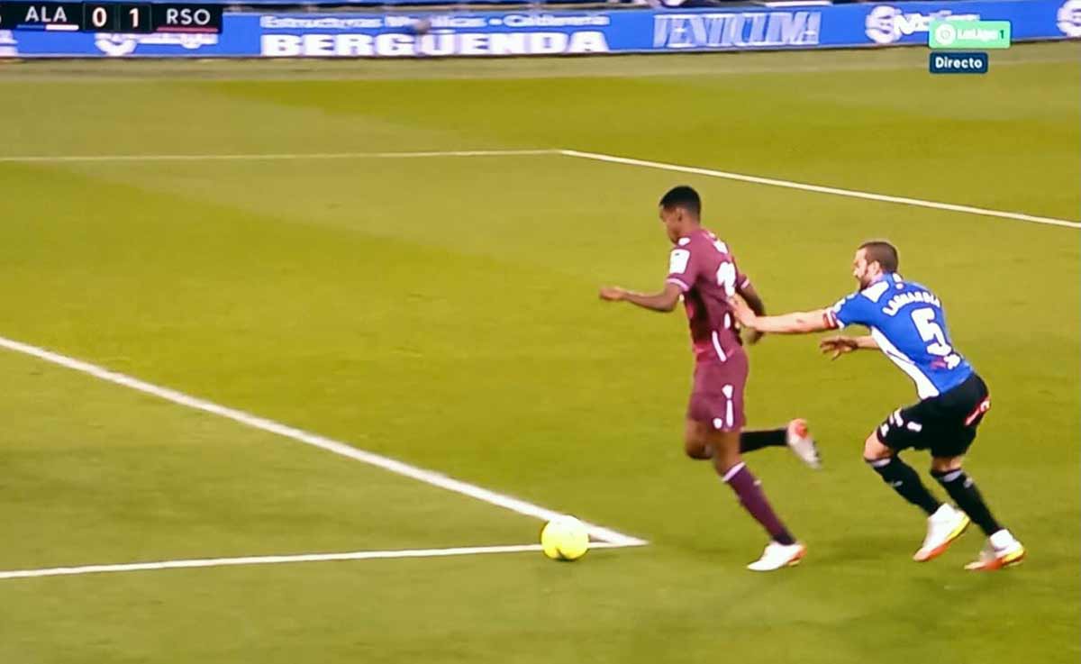 También me vi el Alavés-Real Sociedad. Al pobre sueco de la Real le empujaron que no acabó en la grada tres de la general de milagro. Como en Getafe, uno contra uno. Defensa que empuja y delantero que no puede culminar la jugada. Jugada gris, dijeron. Falso: otra de uno contra uno, nítida. Una broma.