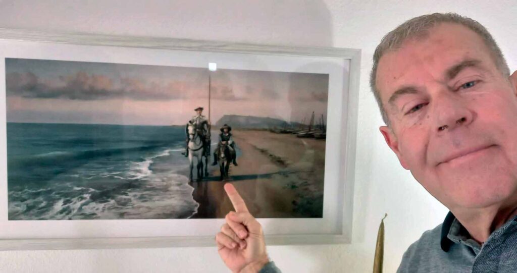 Don Quijote y el buen Sancho. Caminando por la Barceloneta, magnífica obra del maestro Ferrer Dalmau. ¿A que les parece el Madrid? A mí, sí. Sancho, buena Panza, cuando agarra a uno grande o parecido, y Quijote, flaquillo él y la lanza, cuando el rival es menor o parecido. Magnífico.