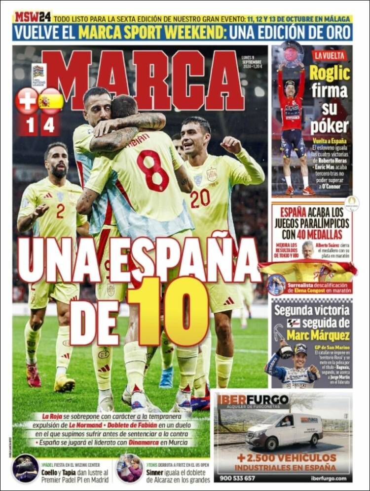 Marca habla de una España de 10. Sobre otras cuestiones, el diario de Gallardo menciona en su parte superior el Marca Sport Weekend. Quizá sea un evento en el cual durante un fin de semana te enseñan a menospreciar al Real Madrid, a ceder portadas a dirigentes que se apropian indebidamente de sus clubes y albergan grupos neonazis en su estadio, a no hablar del mayor escándalo de la historia del deporte español o a poner en el foco a Vinícius. Un Vinícius, por cierto, que se ha erigido, además de en el mejor futbolista, en el mejor desenmascarador de miserables del mundo. Todos aquellos cuyo discurso huele a naftalina se ponen en fila para ir insultando uno a uno al jugador madridista.