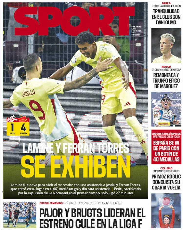 La prensa del FC Barcelona también es muy fan de la selección española, como ya conocéis, y no escatiman loas al combinado nacional, sobre todo a los integrantes del Barça. Fabián marcó dos goles, pero Lamine y Ferran fueron los mejores, ambos repartieron asistencias y Torres además marcó. Joselu probablemente metería el gol sin querer, porque jugó en el Madrid. Además, Pedri se sacrificó por el equipo al ser cambiado tras la expulsión de Le Normand y fue el mártir necesario para que se produjera la histórica victoria por 1-4 contra Suiza.