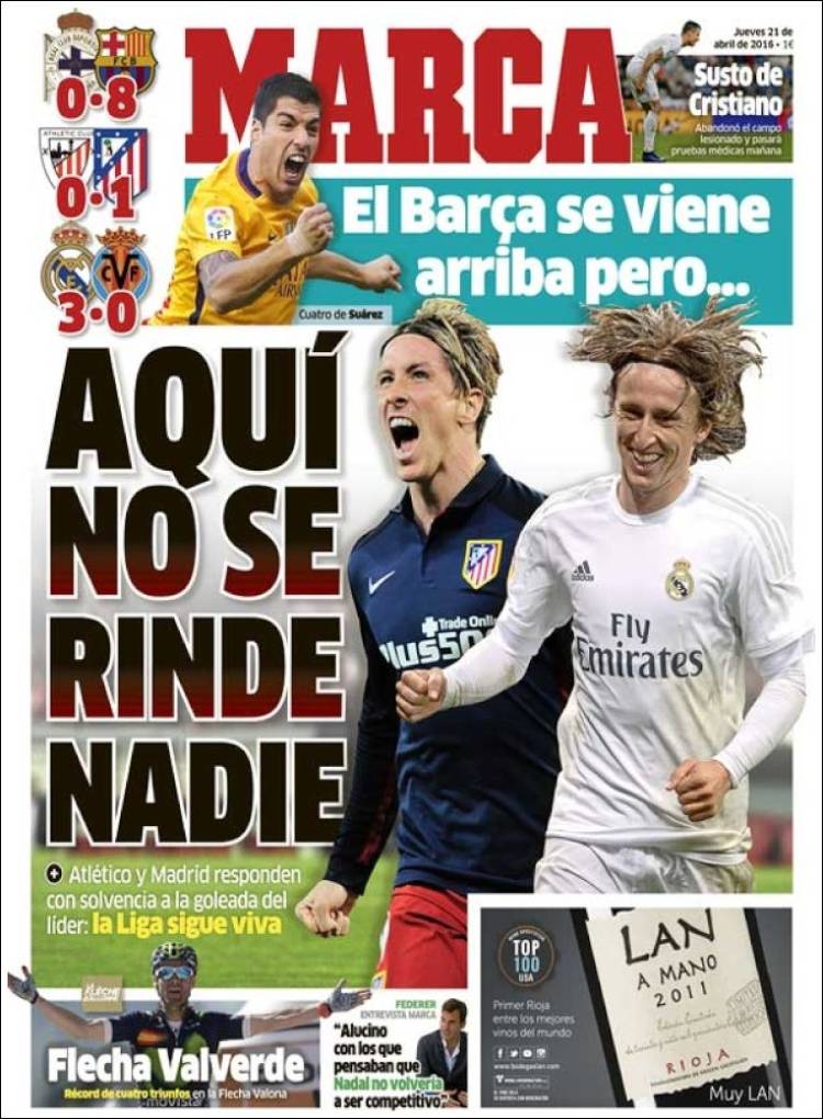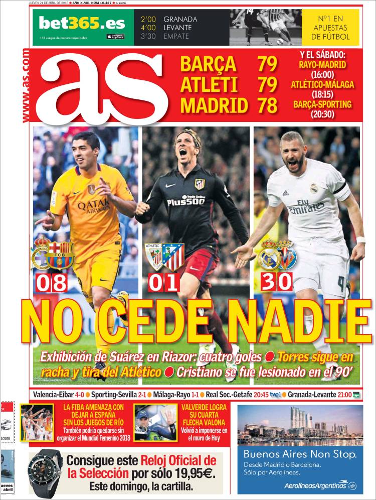 No parece haber aprendido la lección el diario As. No acusa recibo de lo demostrado ayer en el Bernabéu por los chicos de Luka. Mientras que en Coruña hubo una "exhibición de Suárez" y en Bilbao "Torres sigue en racha y tira del Atlético", en Madrid "Cristiano se fue lesionado en el 90'". Así queda resumida la jornada de los tres de arriba en la portada de Relaño. Mayúsculo desequilibrio, ¿no creen? Peculiar selección de las noticias, según la cual -como es costumbre de la casa- todo lo bueno pasó ayer fuera del Bernabéu.