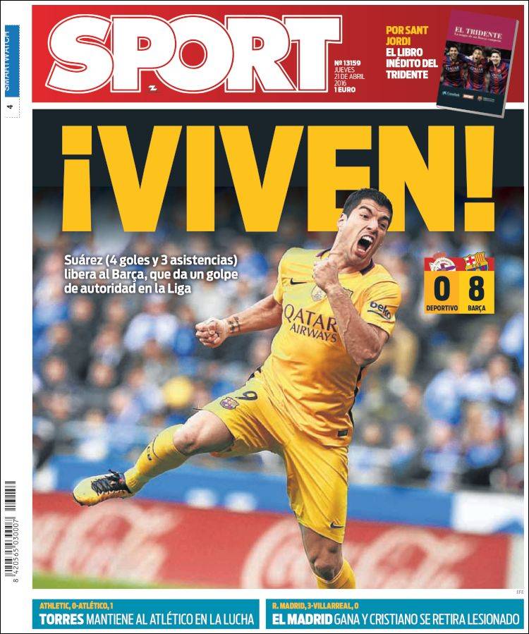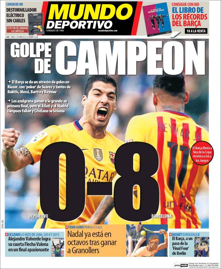 Ya que hablamos de crujir de dientes, no sabemos si es lo más adecuado hacer que Luis Suárez sea el protagonista de las portadas, y menos aún con la boca abierta, mostrando todo el esplendor de su ya icónica dentadura. Se ve que en Barcelona quieren provocar temor a sus rivales y para ello no dudan en sacar sus mejores armas, más o menos como si estuviéramos en uno de esos documentales de leones que tanto contribuyen a la siesta. Cuatro zarpazos dio el león ayer contra el Deportivo, el primero de ellos previa falta por empujón, pero a quién le importa si luego cayeron otros siete goles más; o mejor, a quién le importa un simple empujón cuando el formidable delantero uruguayo tiene un demostrado repertorio en lances selváticos aún de mayor enjundia.