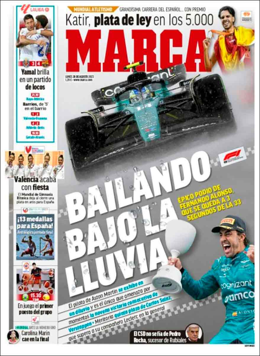 Como os decíamos, las portadas del día de hoy palidecen en acierto y belleza con la de la efeméride que celebramos, pero no obstante os las dejamos por aquí para que las disfrutéis. Enhorabuena a Fernando Alonso y a los atletas españoles del Mundial.