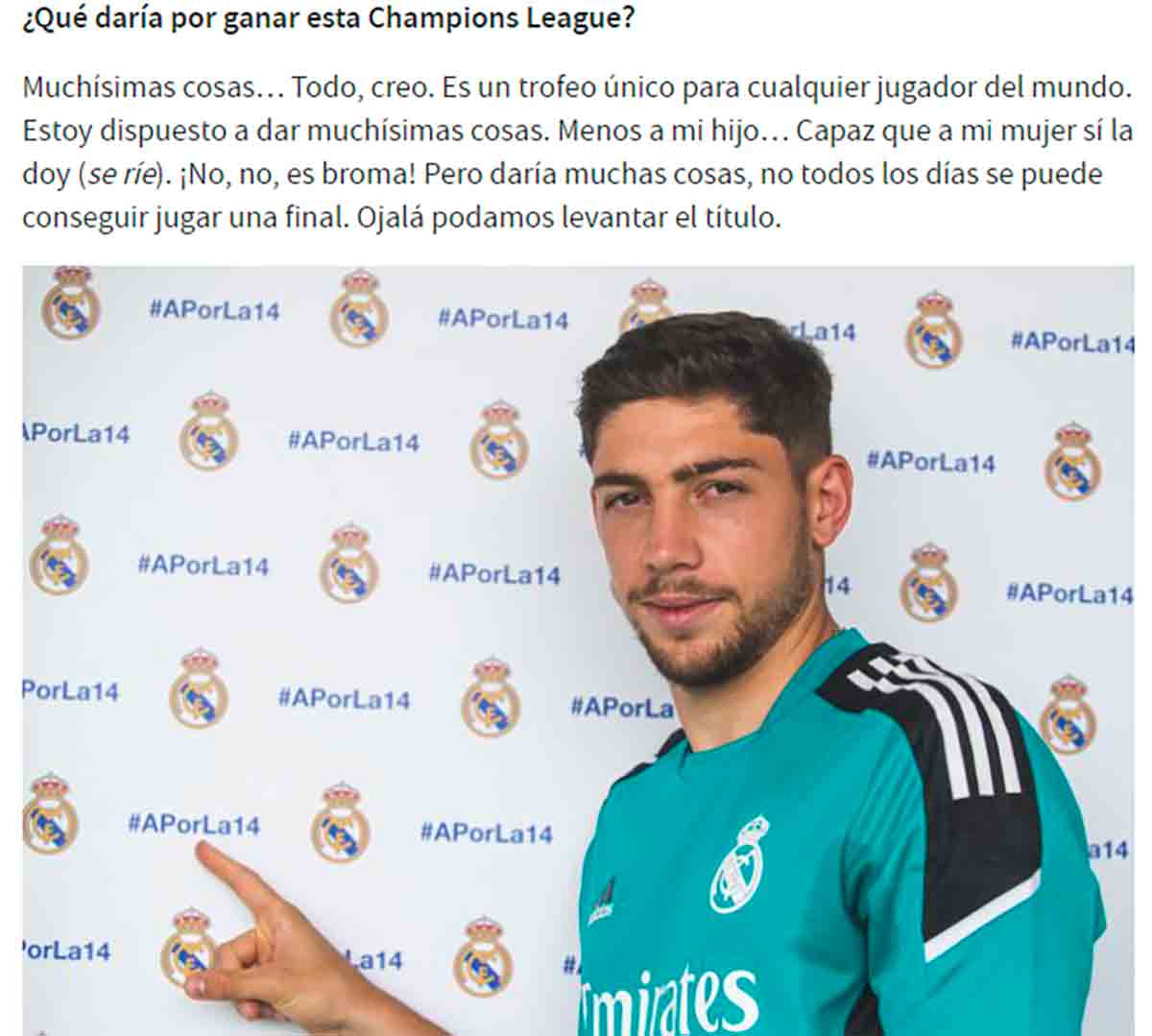 Además, Fede rezuma madridismo y cachondeo. Observad lo que responde cuando As le pregunta qué daría por ganar esta Champions League: