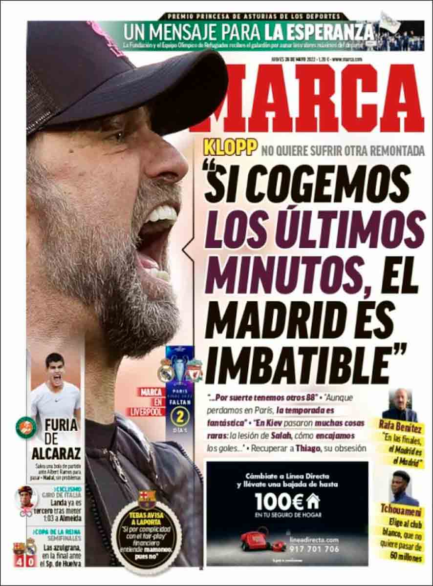 Buenos días, amigos. Aún es jueves, faltan dos días para la final de Champions y los madridistas estamos más nerviosos que don Quijote en un parque eólico. Esta final, esta temporada, esta Champions son especiales. Queremos que llegue ya el partido contra el Liverpool, pero también nos da pena que acabe esta linda campaña. En dos meses de Champions el Madrid ha escrito más historia que la mayoría de clubes del mundo juntos en toda su vida. Hay, además del obvio, muchos motivos para vencer.