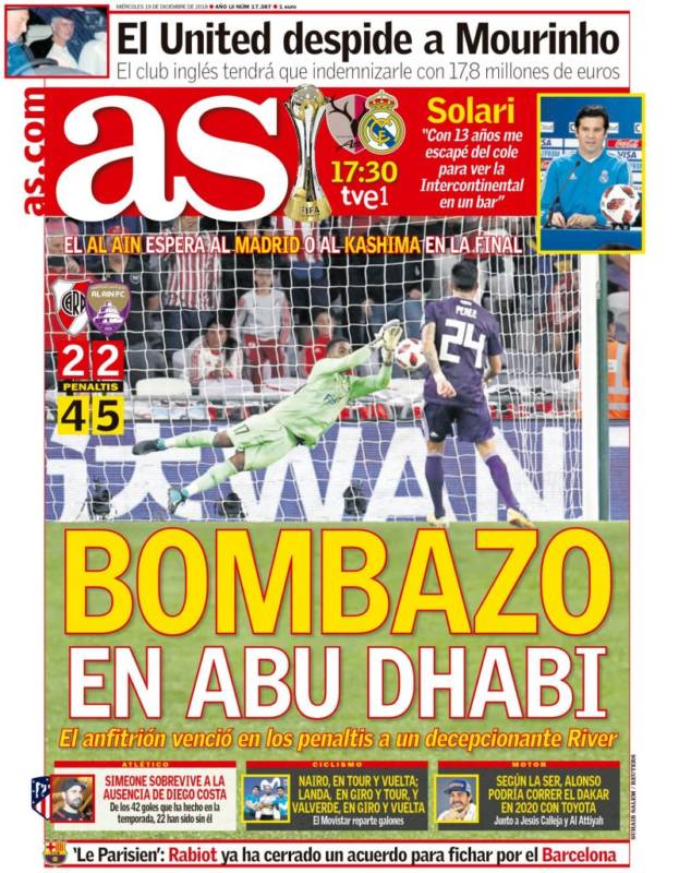 Eso fue ayer. Hoy no existe Mourinho. El madridismo tiene una cita muy importante a partir de las 17:30. Nada más y nada menos que las semifinales del Mundial de Clubes. Al Ain, que eliminó a River Plate en la tanda de penaltis, espera rival en la final. Los de Solari tienen una oportunidad única para cerrar este extraño 2018 de la mejor manera posible, con un título más y una importante inyección de moral que sirva para que 2019 espante las dudas.
