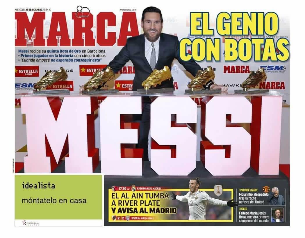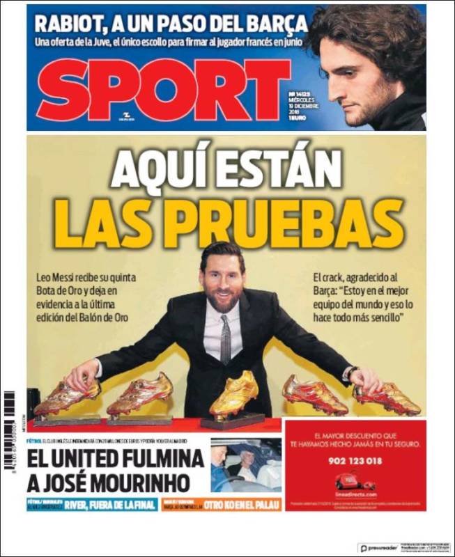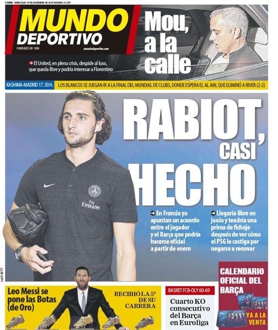 Lo cierto es que la prensa deportiva española, acostumbrada ella a denunciar a los que no quieren hablar de fútbol, hoy habla de todo menos del partido que deberá jugar el Real Madrid esta tarde. Vemos a Mourinho, a Rabiot cerca del Barcelona otra vez, a Messi recibiendo más Botas de Oro que semifinales de Champions League y hasta a River Plate copando -one more time- la portada de 'La Ouija Today'. Del Real Madrid, poquito. Relaño le dedica un hueco, 'Marca' menos que un hueco, 'Mundo Deportivo' un faldón amarillo casi invisible y 'Sport' nada de nada.
