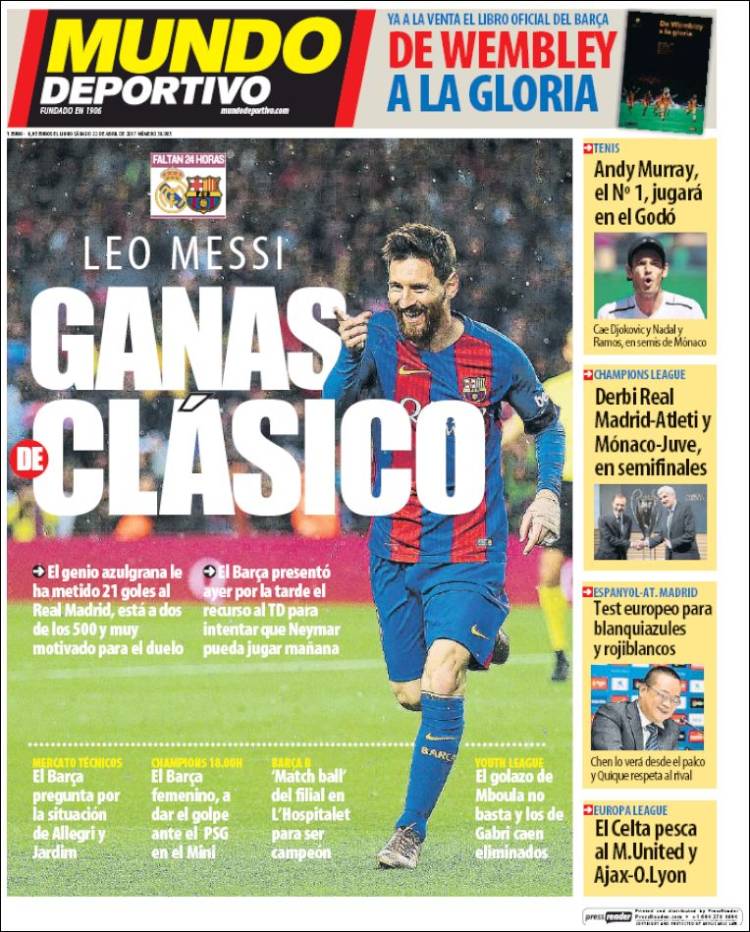 Así que ahí van dos portadas con Messi en primera plana, otra dos, y ya van infinitas más dos. Pero son pocas, él todo lo merece, porque repetimos, Messi siempre aparece en los grandes partidos, no como Cristiano, que se esconde, que no influye en el resultado, que se amilana cuando más toca figurar, que le mete cinco goles al Bayern no porque el portugués aparezca en los grandes partidos, sino para que el ventilador de los tópicos antimadridistas pueda renovar su maquinaria y estar en perfecto estado de revista y mejorarse a sí mismo y no parar de esparcir lo que esparcen ese tipo de ventiladores.