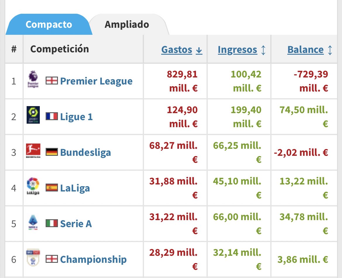 En honor a la verdad, y en el modesto consuelo de tontos que a veces representa el mal de muchos, hay que señalar que no es algo exclusivo del fútbol español. El resto del balompié europeo hace un ridículo con respecto a la Premier solo ligeramente menos embarazoso en el caso de la Bundesliga (68,2 millones) y por el estilo que la Serie A italiana (con 31,22). Francia, aun a una distancia sideral de los ingleses, ha gastado más, con 124,9 millones.