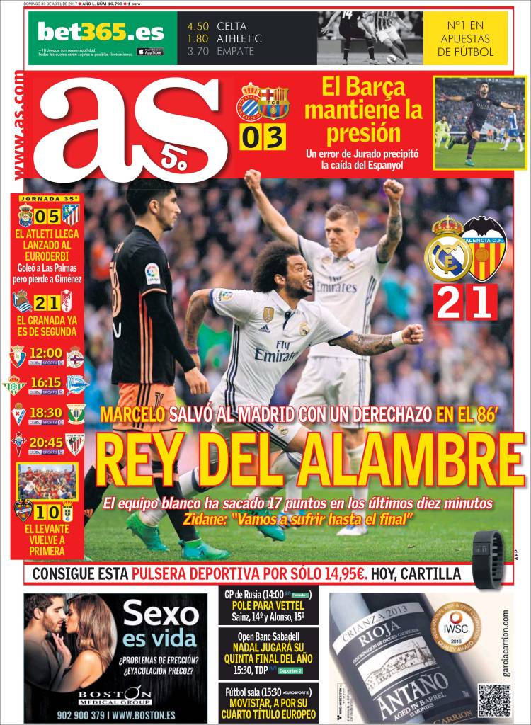 El gol de Parejo abrió los cielos de As para que empezara a llover, para que la tormenta eternamente anunciada por fin cayera inmisericorde como justicia divina. Pero no pudo ser. Llegó Marcelo, cuya samba no es de este mundo, para cambiar el parte meteorológico, porque Marcelo, llueva a truene, siempre juega cantando Here comes the sun. Y a Relaño, al que seguramente le gusta más entonar A hard rain's a-gonna fall, tuvo que recoger velas para traernos una portada ni pa ti ni pa mí, la primera plana del casi, la del alambre, la que diciendo que "el equipo blanco ha sacado 17 puntos en los últimos diez minutos" en realidad parece querer decir "ojalá el equipo blanco no hubiera sacado 17 puntos en los últimos diez minutos" o, dicho de otro modo, "menudo equipo sin proyecto, con flor, potra y mecagontó que saca 17 puntos en los últimos diez minutos".