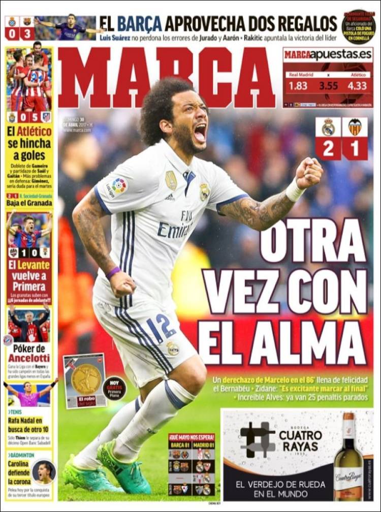 Marca le da al mismo hecho una interpretación bien diferente. Donde As dice alambre, Marca destaca la raza de un equipo que cuando quiere suele poder, que cuando se ve contra las cuerdas suele reaccionar para que (casi) nunca sea demasiado tarde, un equipo tal que cuando otros ya se frotan las manos organizando las exequias del cuerpo, es el alma la que deja para otro día -siempre será otro día- la celebración ajena y el trabajo de las plañideras. Plañir, qué será eso. ¿Cómo vamos a pedirle a Marcelo que sepa conjugar dicho verbo? ¿Cómo vamos a pedirle a Marcelo que sepa conjugar más verbos que bailar?