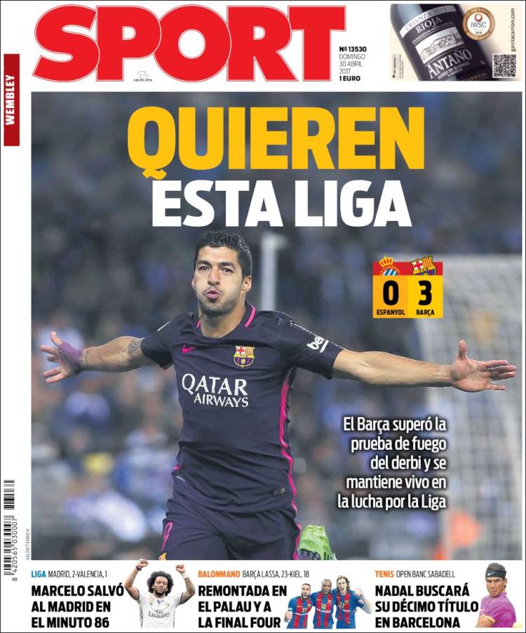 "Quieren esta Liga", titula Sport sobre Luis Suárez, y nos parece muy bien que la quieran. Cómo no quererla, dicho sea de paso, si de nuevo ya no pueden querer la Champions, de la que han caído eliminados otra vez de nuevo en cuartos y de la que debieron caer eliminados en octavos. Pero comparen ustedes fotos y expresiones y deseos y estímulos y ganas. Miren a Marcelo celebrar su gol contra el Valencia y vuelvan a mirar a Suárez celebrar su gol contra el Espanyol. Nosotros, que queremos esta Liga, tenemos claro quién quiere más esta Liga.