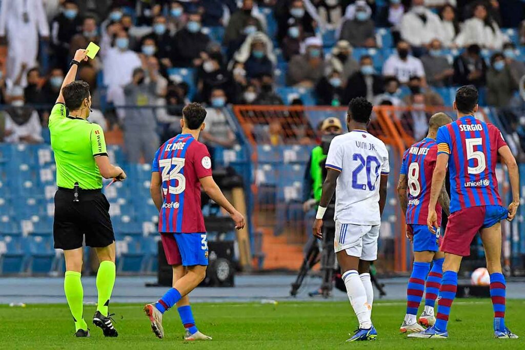 En la segunda parte Alves ya no pudo librarse cuando derribó a Vinicius en el 50'. También, lo hizo Busquets en el 58' abriendo los brazos e impactando el derecho en el rostro del brasileño. El jienense estaba a cuatro metros, lo vio y dejó seguir la jugada. Cuando se detuvo el juego se esperaba la amarilla pero no, lo dejó en amonestación verbal. Qué falta total de autoridad. Las dos últimas tarjetas fueron para madridistas: Casemiro en el 74 por agarrar a Gavi y Valverde en el 98' al quitarse la camiseta en la celebración del gol. Demasiado pedir hubiera sido una amarilla a Araújo que repartió bastante en la segunda mitad y en la primera parte de la prórroga. Pero ya sabemos, como hemos comentado, que el trencilla de Jaén es manso y flojo para echarse la mano al bolsillo. Al final, la conclusión fue que hubo reparto de amarillas para ambos equipos con un equipo culé haciendo 7 faltas más que los blancos.