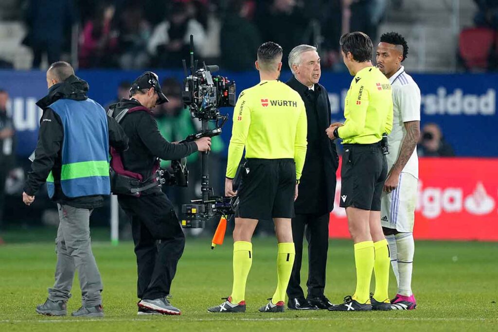 Pamplona siempre es sinónimo de partidos intensos, duros y de meter la pierna. En el 4' quedó patente con una entrada tardía y fortísima de Torró a Camavinga. El canterano madridista impactó con su planta en la pierna del francés. Fue amarilla, pero era una acción perfectamente de expulsión por un juego brusco grave. Las otras amonestaciones de la primera mitad llegaron al final de la primera mitad. Primero, Moncayola agarró a Vinicius en el 46' cuando se iba y un minuto después el colegiado en una decisión salomónica amonestó al brasileño del Real Madrid y a Moi Gómez por encararse en un pique dentro del área.