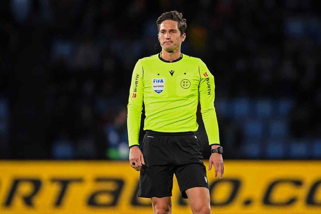 Partido bastante plácido para el jienense que, salvo algún detallito, llevó correctamente. En la primera mitad debió señalar alguna falta de Tenaglia sobre Vinícius en lugar de indicar al brasileño que se levantase. También hubo un par de orsais en jugadas prometedoras que no eran por poco, pero eso va en el debe de su línea de la banda derecha. La única amarilla fue para Modric en el 32' al llegar tarde y entrar con la planta a Escalante.