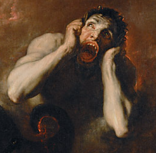 A pesar de que Dios Padre trata de explicarle que igual no debió comprarse un dúplex junto al campo de batalla donde se dirimía el combate entre las fuerzas del Bien y el Mal, Ruido Bernabéu entra en colapso nervioso (momento que capta el artista en el cuadro) justo antes de comerse todas sus bufandas del Atleti, arrancar de las paredes sus posters del Cholo Simeone y romper el marco de su foto con Cerezo en la comunión de la sobrina de Manolo Lama.