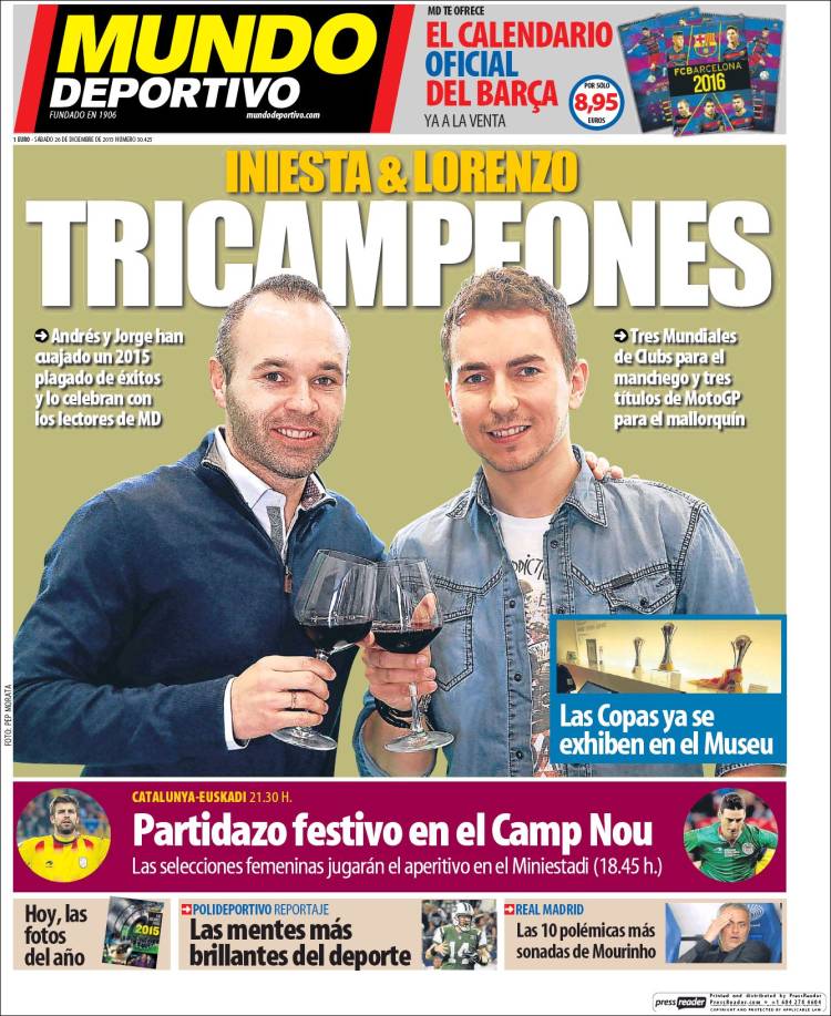 En cambio, amigos, con qué paz nos arrullan las portadas catalanas, qué eterno cuento de Navidad. Sabemos que el niño Jesús ha nacido ya, pero reconocemos que nos choca un poco que, según los diarios deportivos de(l) Barcelona, no solo nazca una vez al año, sino todos y cada uno de sus días. Mucho nacer es eso, pero quiénes somos nosotros para negar tan magno acontecimiento. Y menos cuando ya Marca se pregunta si la actual delantera del Barcelona es la mejor de la historia. Nada menos. Sin asomo alguno de exageración oportunista, qué va, y totalmente entregado el diario madrileño a su labor lechera. Podríamos citar otros jugadores y otras delanteras históricas, pero disculpen si el sonrojo (y las pocas ganas de convencer a según quién) nos lo impide.