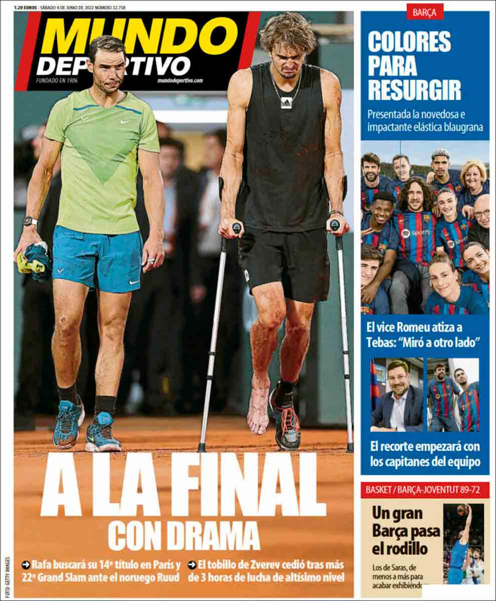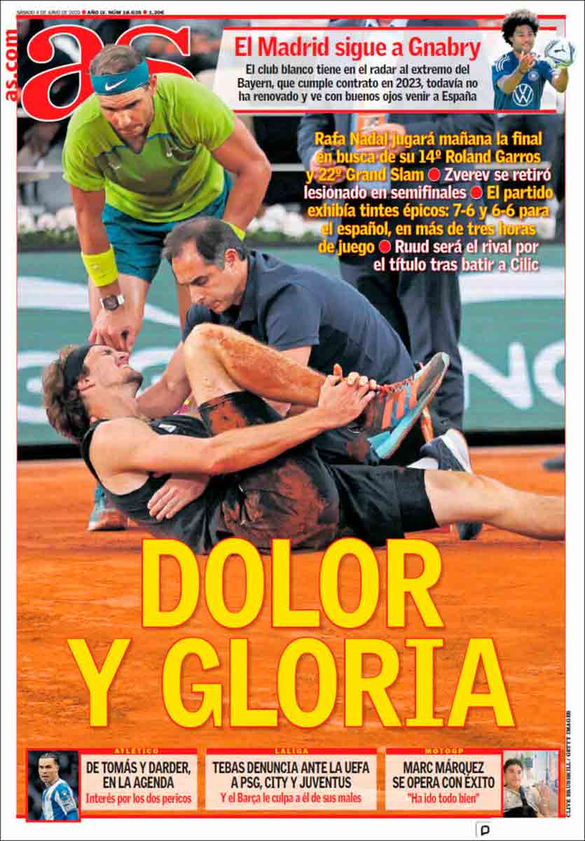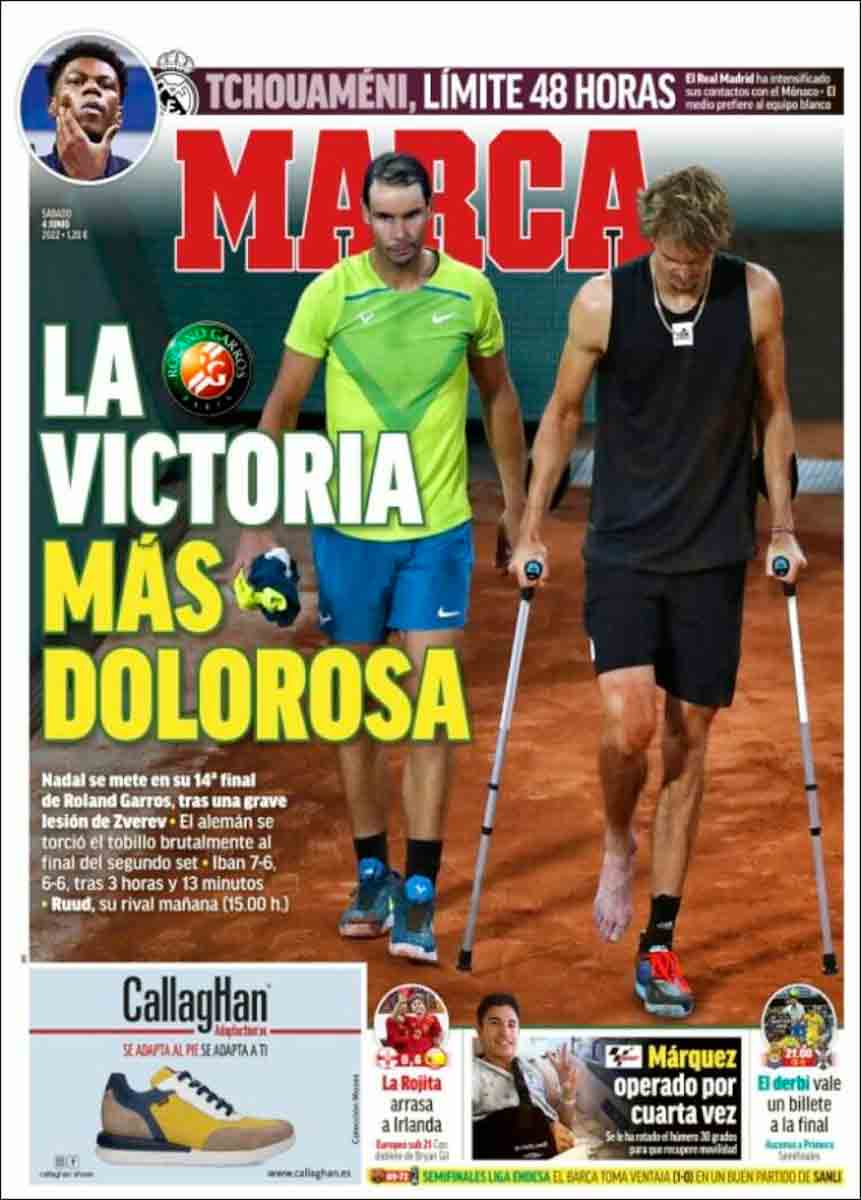 El diario Marca centra también su portada en el tenis y en el dolor, con la lastimosa imagen del alemán Zverev tras abandonar la pista con muletas. Mucha suerte para Sasha, al que deseamos una pronta recuperación. A Nadal le toca ahora centrarse en preparar la final contra el noruego Ruud, otro tenista monovocálico como nuestro Rafa Nadal, o como los otros semifinalistas, Cilic y Zverev. Del club de Alcaraz, Zapata, Federer, Medvedev, Schwartzmann, Ferrer, Mirnyi y Dolgopolov.