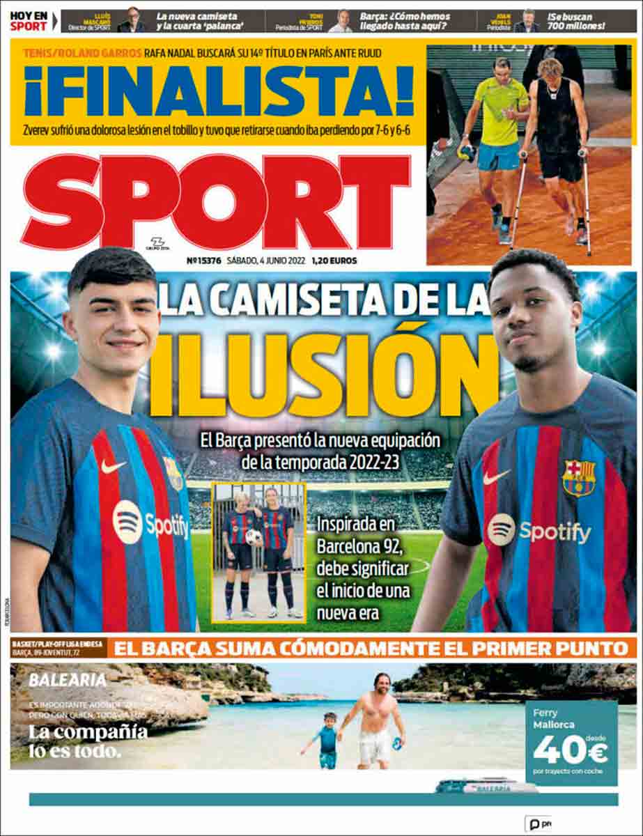 Mundo Deportivo lleva a la portada la imagen de los dos magníficos tenistas junto a lo que denomina "colores para resurgir". La nueva camiseta del Barça, ya ven. Como se aprecia mucho mejor en Sport, os la traemos a continuación.