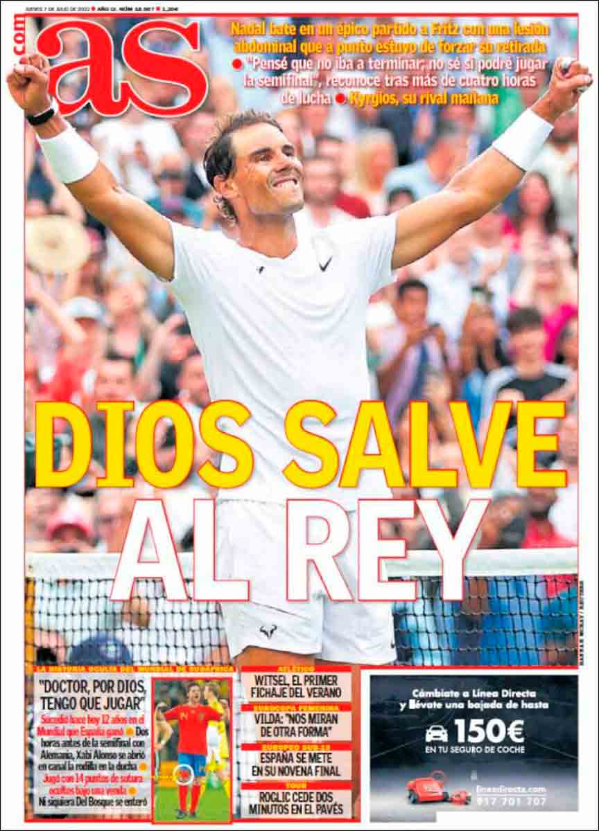 As dice que Nadal es el Rey y solicita a Dios que le salve. Nada que objetar. Ignoramos si los de la redacción han reparado en la coincidencia de que en la misma primera plana salga también la revelación de Xabi Alonso, a saber, que jugó la Final del Mundial de Sudáfrica con catorce (¡precisamente catorce!) puntos de sutura en una rodilla por una caída en la ducha, dato de brutal estoicismo que ocultó al mismísimo Del Bosque. No sabemos si incluir ambas historias de bravura en la misma portada es algo que se haya hecho adrede, pero merecería que así fuese. Dos historias de bravura y de madridismo elevado a la enésima potencia. Dos caballeros blancos (Nadal ganó ayer vestido de ese color, y esto sí que no es casualidad) unidos por su indestructible empeño. “Doctor, ¡tengo que jugar!” Eso mismo se lo grita Nadal cada día que juega no al médico, sino a Dios. Y Dios le hace caso, claro, aunque ya puestos podría también quitarle el dolor.