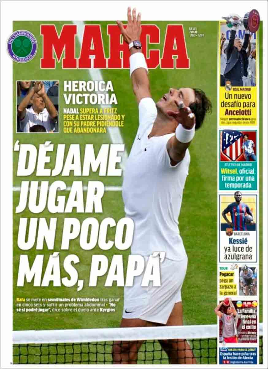 Buenos días. Rafael Nadal, otra vez, y esta vez de modo aún más épico que de costumbre. Ya está en semifinales de Wimbledon a base de dejarse la vida, lesionado, esquivando con un gesto de rabia la confesa tentación de abandonar en pleno partido, tal y como su señor padre le indicaba desde la grada que hiciera, con gestos inequívocos.