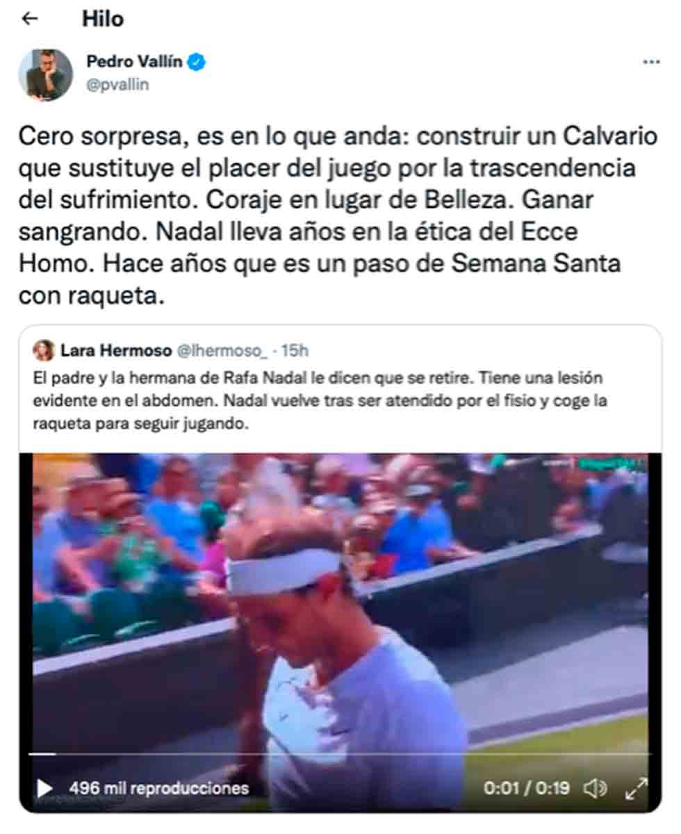 A Pedro Vallín lo le gusta que Nadal gane sufriendo. Desolación en el mundo del tenis, que necesitaba imperiosamente la aprobación de Pedro Vallín para poder admirar a Rafa. Ahora ya el mundo del tenis se ha quedado como a pie cambiado, sin saber si ir a volear poniéndose a Rafa por montera o quedarse en el fondo de la pista de la indiferencia. Estaría bien que Pedro Vallín nos aclarara si, a pesar de que por lo visto no es lícito ganar más que gozando (ya lo decíamos: son la estética y la ética cansinas del xavismo), a pesar de que el coraje está por lo visto reñido con la belleza, a pesar de que el mérito y el denuedo están por lo visto fatal en la óptica del chavismo (perdón: xavismo), es o no es legítimo admirar a Nadal. Tal vez sea lo que hay que hacer pero a la vez esté mal, como le pasó al gol de Bale en la Final de Mestalla según Ángel Cappa.