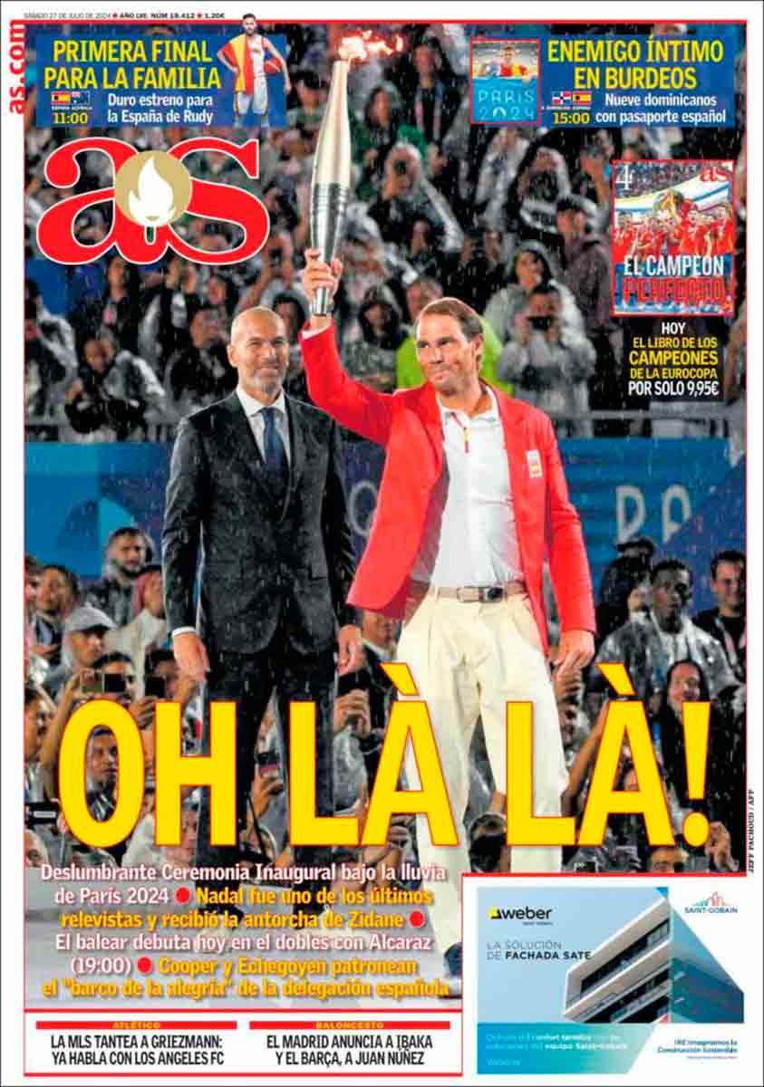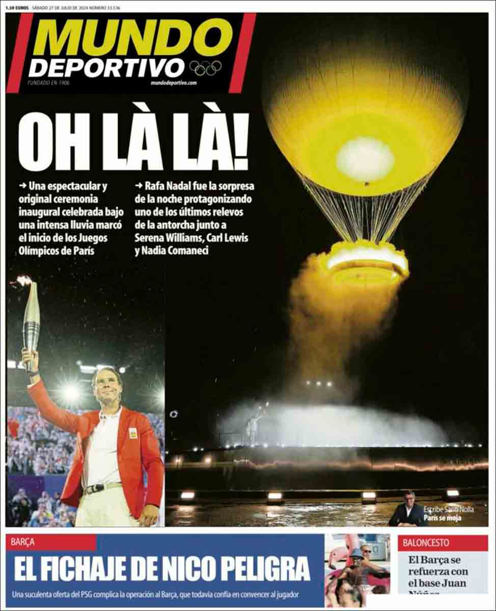 "OH LÀ LÀ!". Si el espíritu olímpico representa lo mejor del ser humano en su afán por mejorar y competir, no pudo haber mejores representantes en la ceremonia inaugural que estos dos grandes del deporte. Fue uno de los mejores momentos de una noche pasada por agua. Un momento tan grande que también la portada del Mundo Deportivo quiso reconocer de manera muy parecida.