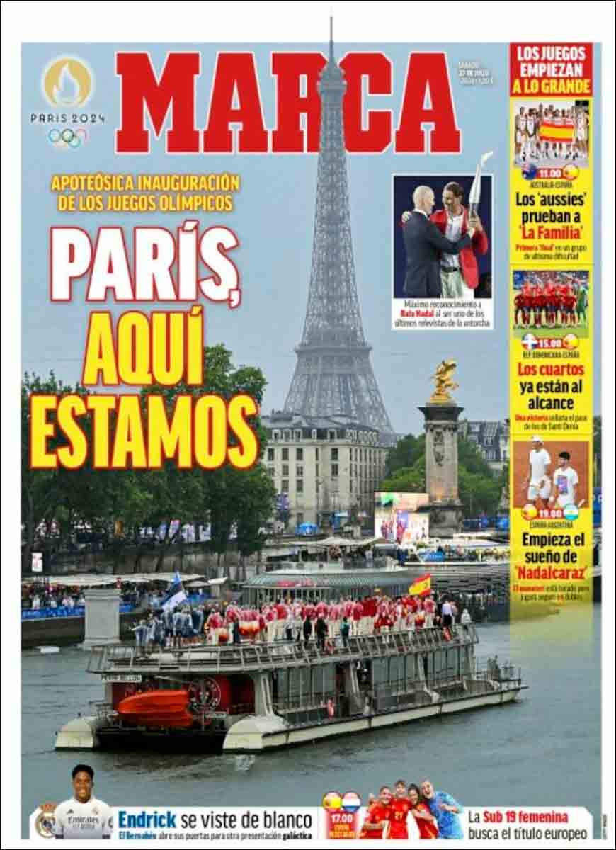La portada de Marca destaca en parte la “soledad” de esa presentación de los países por separado y muestra una vista panorámica con la Torre Eiffel al fondo, la delegación española en el momento de su aparición y un aviso a la ciudad anfitriona con la coma del vocativo perfectamente puesta.