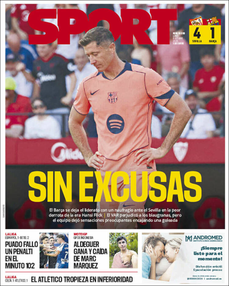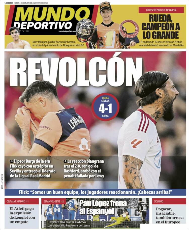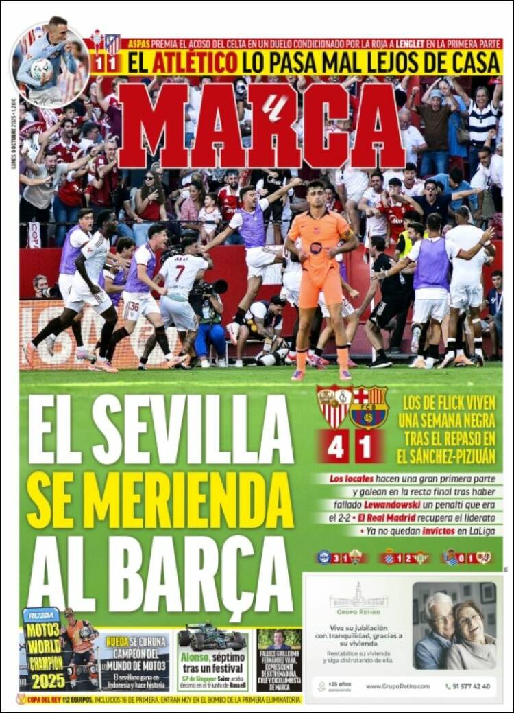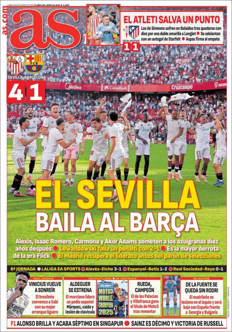 En la prensa deportiva capitalina, el protagonismo corresponde también a la sangrante derrota culé a orillas del Guadalquivir. Tanto As como Marca recuerdan que ya no hay invictos en la competición, que Lewandowski marró un penalti con el que los de Flick pudieron empatar y que nunca había recibido tantos goles, bajo sus órdenes, el equipo del bávaro.
