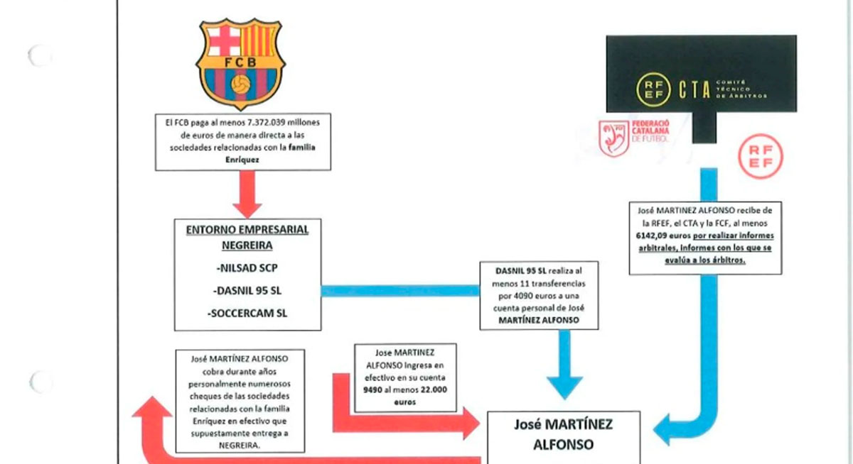 Aparece un nuevo protagonista, José Martínez Alfonso, juez de línea durante años de Negreira y amigo íntimo. El Barça pagaba —realizó 135 transferencias— al entorno empresarial del vicepresidente arbitral (Nilsad SCP, Dasnil 95 SL, Soccercam SL). Estas sociedades interpuestas bien transferían dinero a José Martínez Afonso, bien se lo facilitan en metálico y él lo ingresa en una de sus cuentas. Además, durante años, este sujeto cobraba personalmente cheques en efectivo de estas sociedades que, supone el Instituto Armado, entregaba a Negreira.