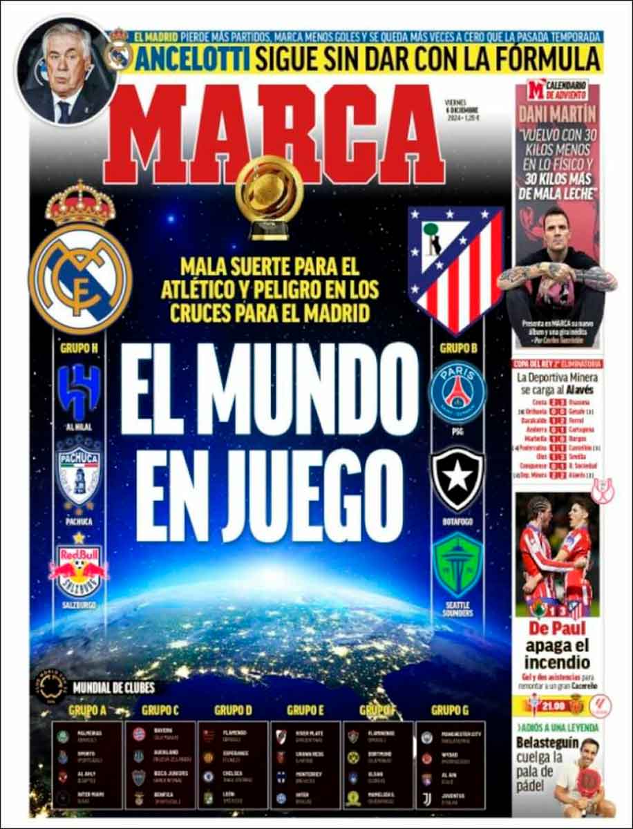 Fuera del asunto principal del día no recogido por los diarios, cabe destacar que ayer se sortearon los grupos del Mundial de Clubes que tendrá lugar en EEUU en junio y julio del año que viene. Al Madrid le ha tocado un grupo asequible, aunque no habrá que despistarse, y tendrá como rivales al A-Hilal, el Pachuca y el Salzburgo. Si bien en octavos, en caso de que no haya sorpresas, podría enfrentarse al City o a la Juve.