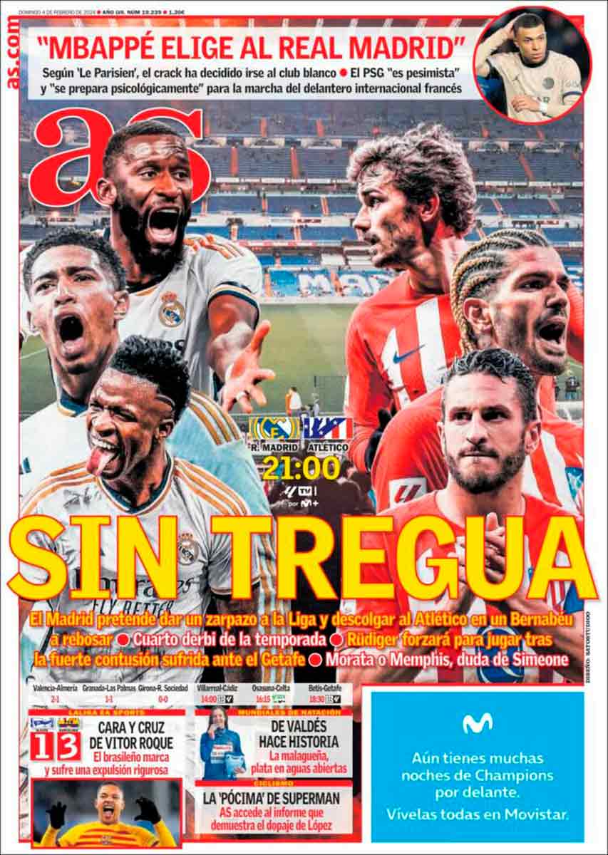 As también decida su portada al Madrid-Atleti, pero su azotea a Mbappé. Según Le Parisien, Kylian habría decido jugar en el Madrid. Lo de siempre, cuando haya comunicado oficial lo creeremos. Mientras tanto, a disfrutar de este maravilloso equipo que tenemos y quizá no se pondera como merece.