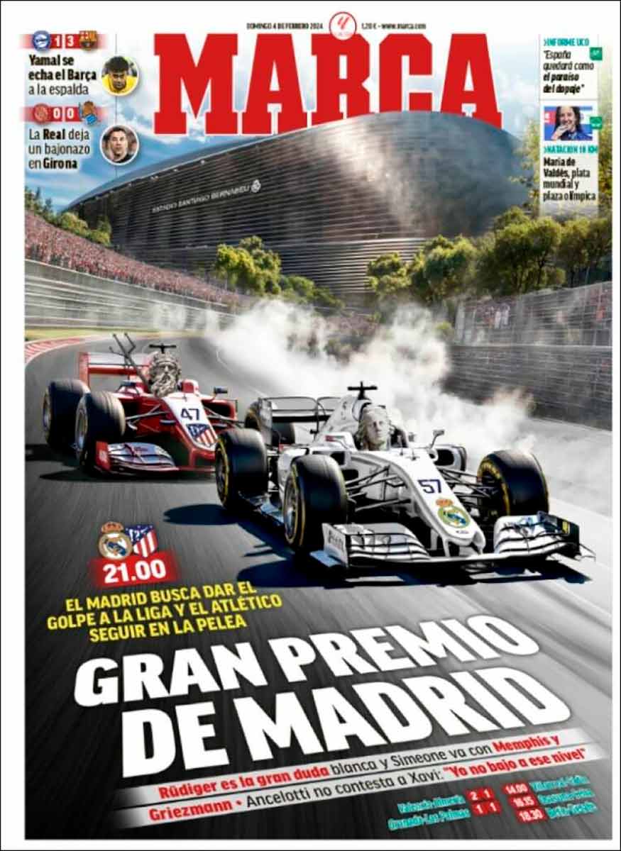 Marca aprovecha el asunto de la Fórmula 1 en Madrid para componer una portada con dos monoplazas circulando por las inmediaciones del Bernabéu tripulados por Cibeles y Nepturo. «Gran Premio de Madrid». Bueno, en fin, que habrá a quien le gusten estas cosas.
