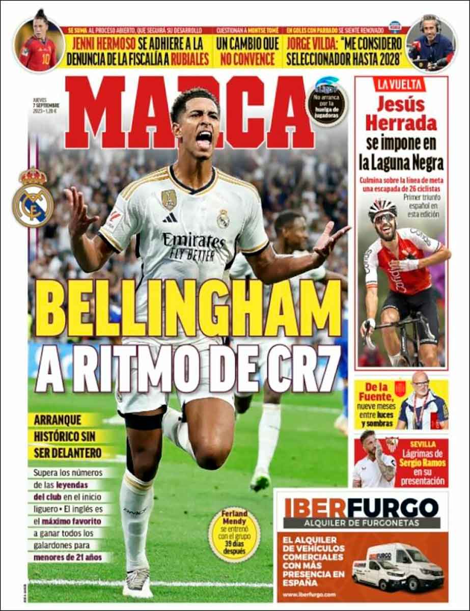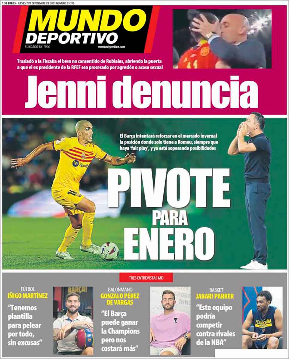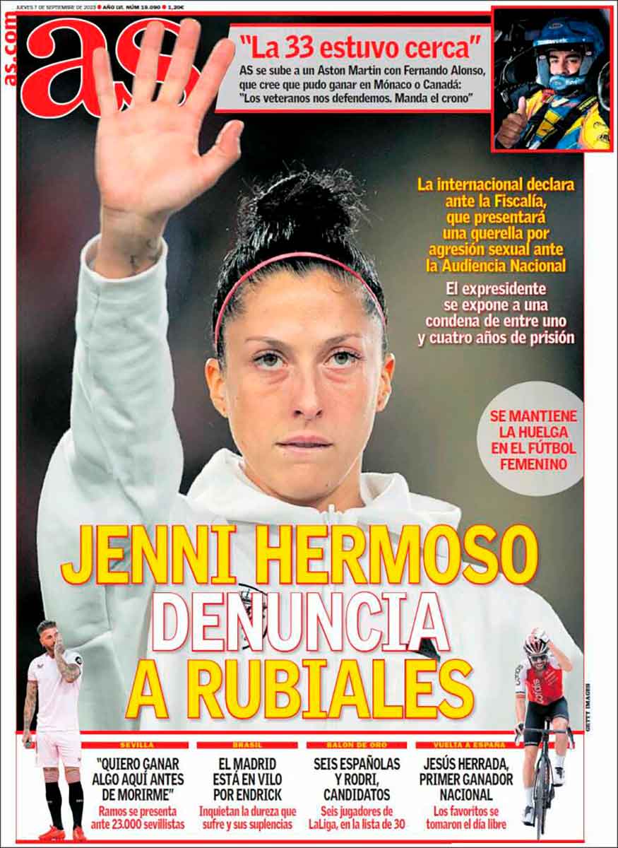 El diario As decide abrir con la noticia común al resto de portadas, la denuncia de Jennifer Hermoso a Rubiales. La futbolista ha declarado ante la Fiscalía, que presentará una querella por agresión sexual ante la Audiencia Nacional.