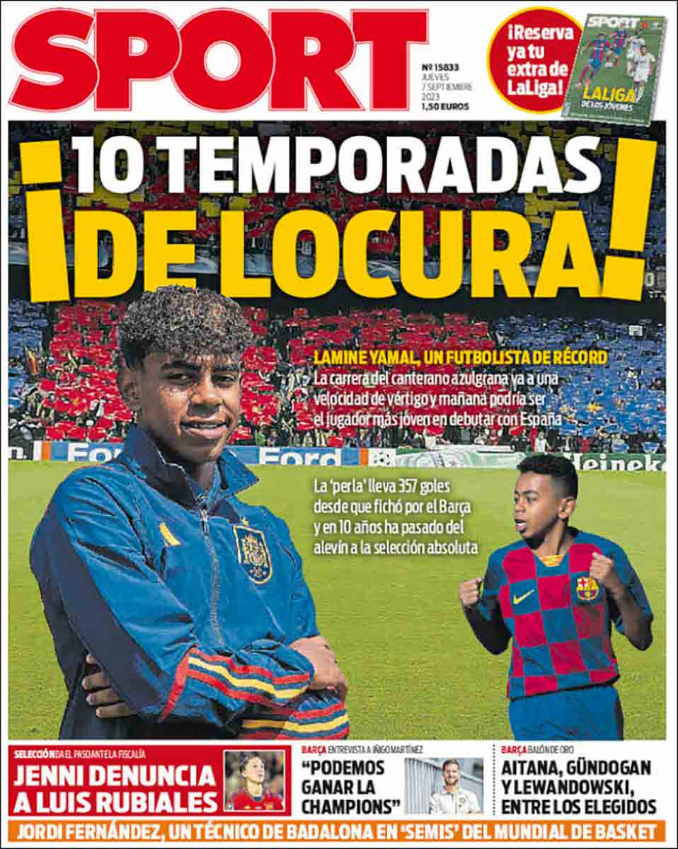 Sport titula «¡10 temporadas de locura!». Pensábamos que se referían a la colección de locuras perpetradas por el Barça en los últimos 10 años: inscripciones sin dinero, palancas y repalancas ficticias, corrupción continuada deportiva, condena por el caso Neymar, tráfico de órganos, despidos improcedentes, mobbing… paramos, que este portanálisis es finito. Pero no, el titular se refiere a Lamine Yamal. Pues muy bien, oigan.