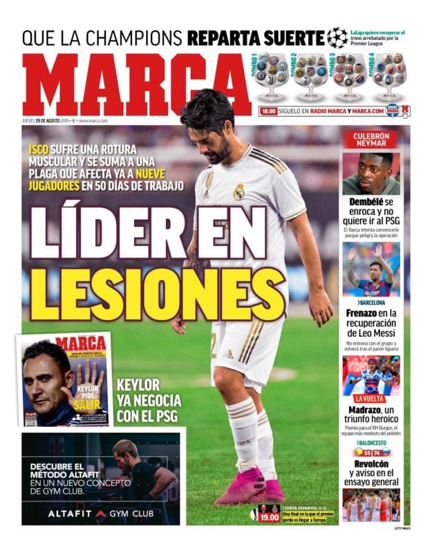 Marca, por su parte, pone el dedo en la llaga señalando la preocupación que cunde en el madridismo a cuenta de las lesiones musculares que asolan al equipo en estos primeros compases de la 19/20. Isco ha sido el último en caer (parece que tiene para un mes) y no hay más remedio que admitir la veracidad de la preocupación que el madridista medio siente a este respecto. Nueve jugadores lesionados en poco más de mes y medio no es de recibo, si bien el tema es crónico y quizá la explicación deba trascender esta pretemporada e inicio de Liga.